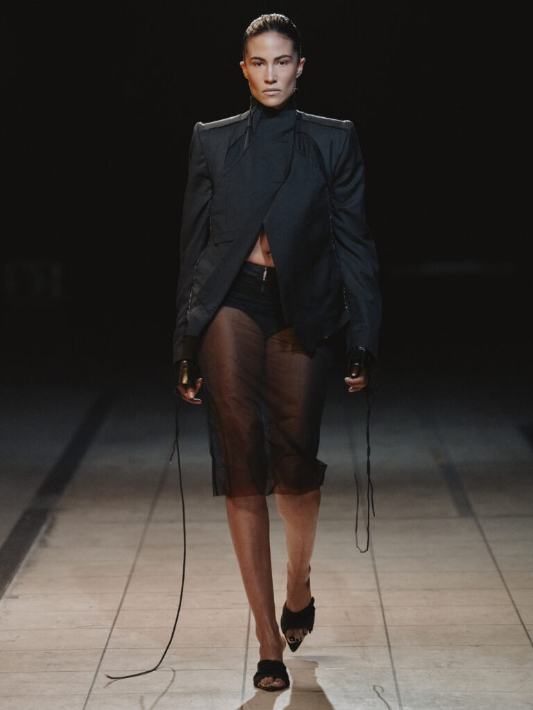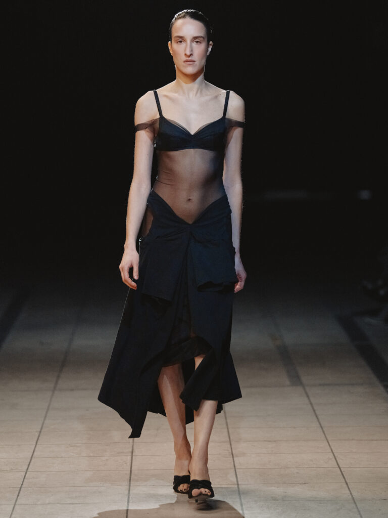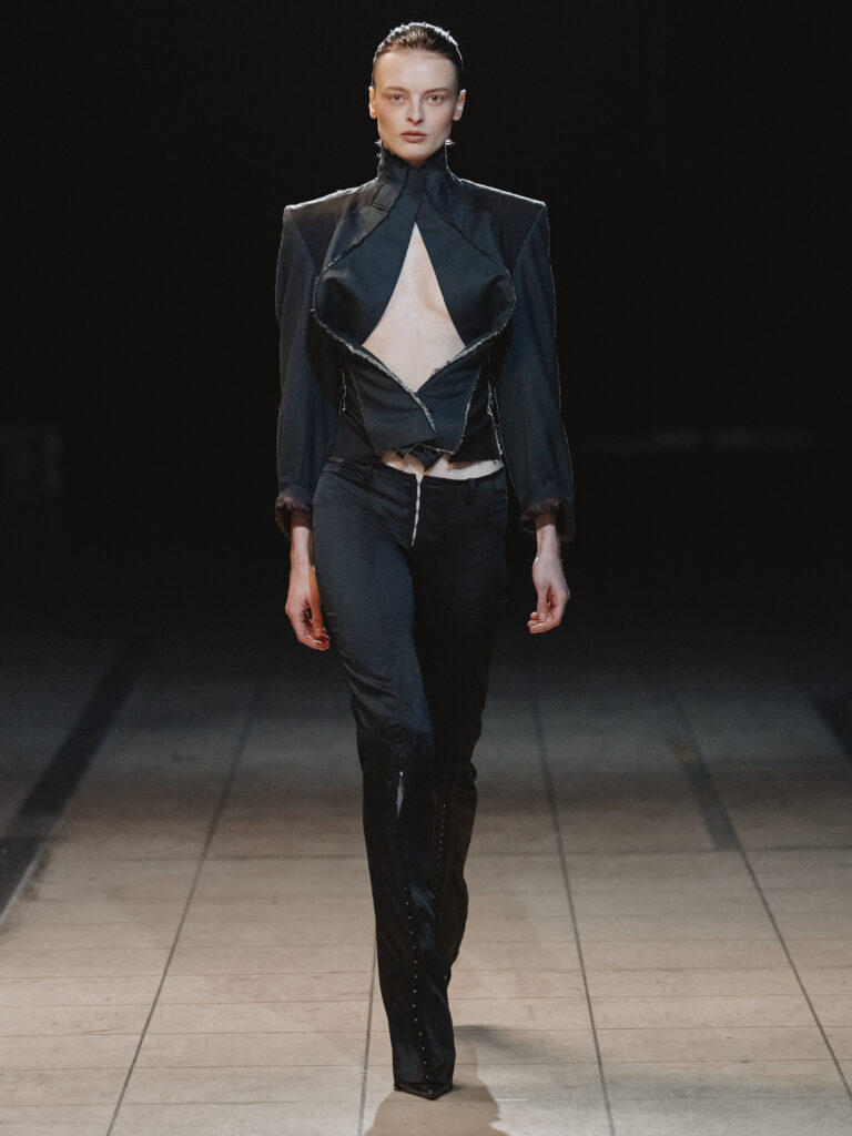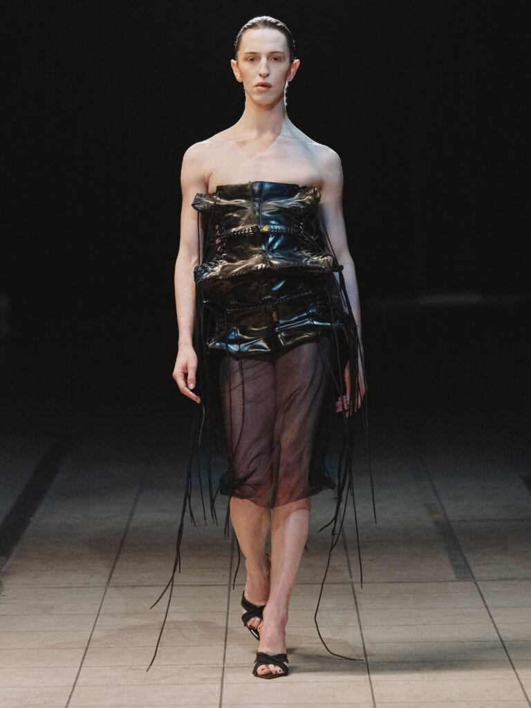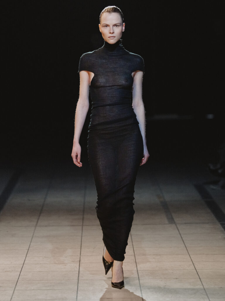 Die Figur der Schurkin wird ohne Klischee und Kostüm neu interpretiert. Dunkle Nuancen aus skulpturaler Wolle, fließendem Jersey, festem Leder, engem Satin und Mesh werden durch Textur, Drapierung und Verschlüsse akzentuiert und formen eine schlanke, verlängerte Silhouette, die durch unerwartete Volumina gebrochen wird.