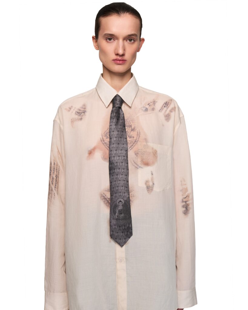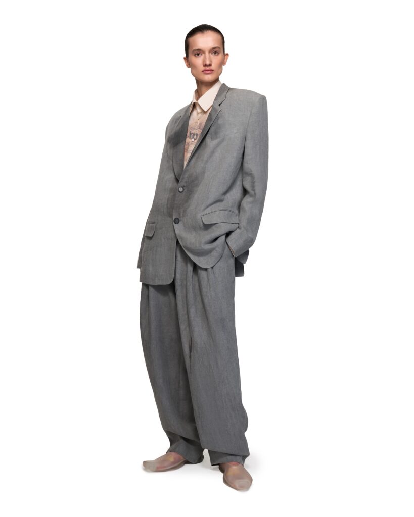 Odyssey, ein Leinenanzug, spielt mit den Codes der Retro-Bürouniform. Unisex und fließend in der Silhouette, erzählt er von innerem Konflikt und spiritueller Suche. Details wie feuchtigkeitsähnliche Flecken auf dem Hemd kontrastieren mit buddhistischen Tattoos auf der Haut darunter. Eine poetische Reflexion über die Spannung zwischen öffentlicher Rolle und innerem Selbst.