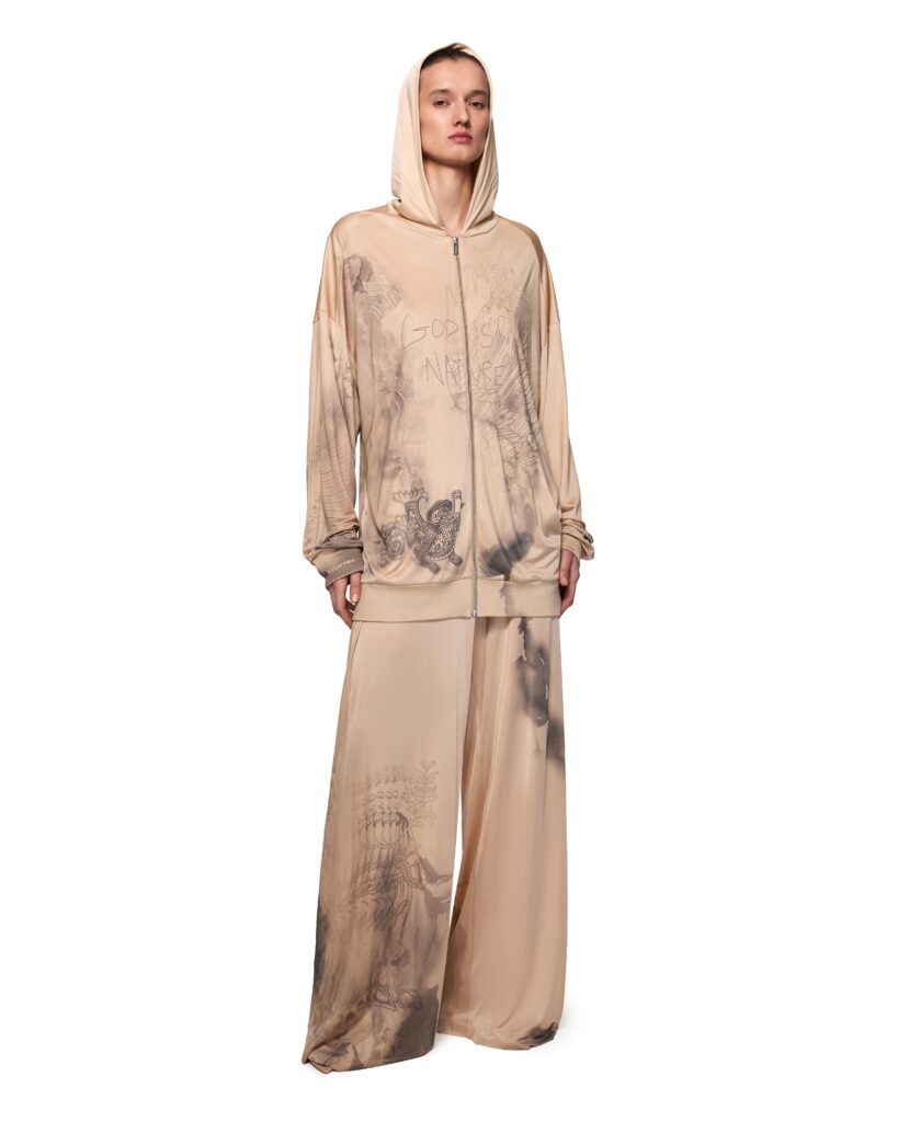 Ein weiterer Hingucker: ein beigefarbener Bodysuit mit schimmernder Oberfläche, die den Eindruck erweckt, der Glanz käme direkt aus dem Körper. Exklusiv entwickelte, leuchtende Schichten machen das Stück zugleich futuristisch und zutiefst organisch: Eine kleine Couture-Revolution.