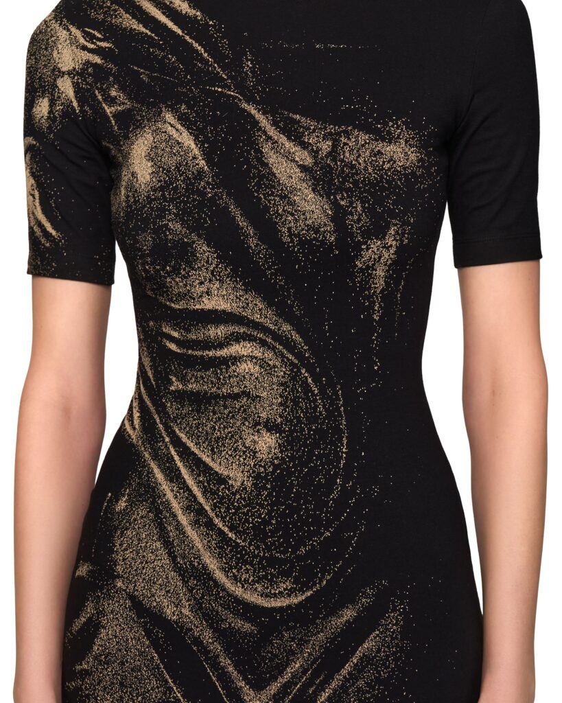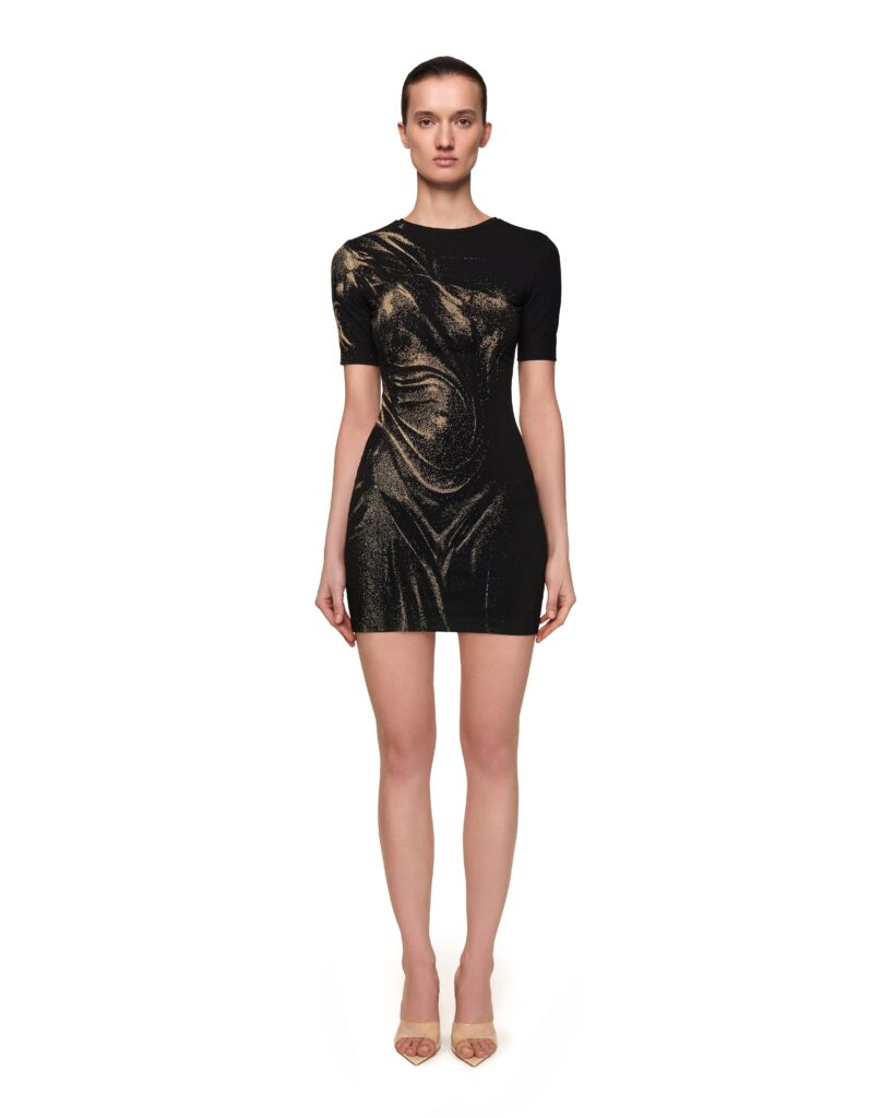 Highlights sind unter anderem ein Bodysuit-Look kombiniert mit Radlershorts, veredelt durch einen ultra-realistischen Körperdruck und transparente Silikon-Applikationen. Die haptische Oberfläche vermittelt Spuren von Heilung und Rekonstruktion, ohne den künstlerischen Ausdruck zu stören.